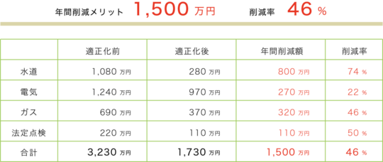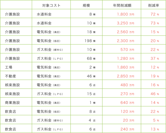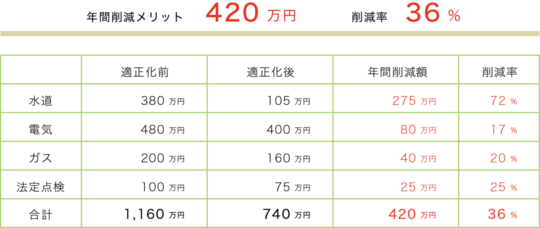 対象コストやお客様のご契約プランとご利用状況によって削減率は異なりますが、水道料金、高圧電力の電気料金、プロパンガス料金の適正化の場合は比較的、高い削減率が見込めるコストです。